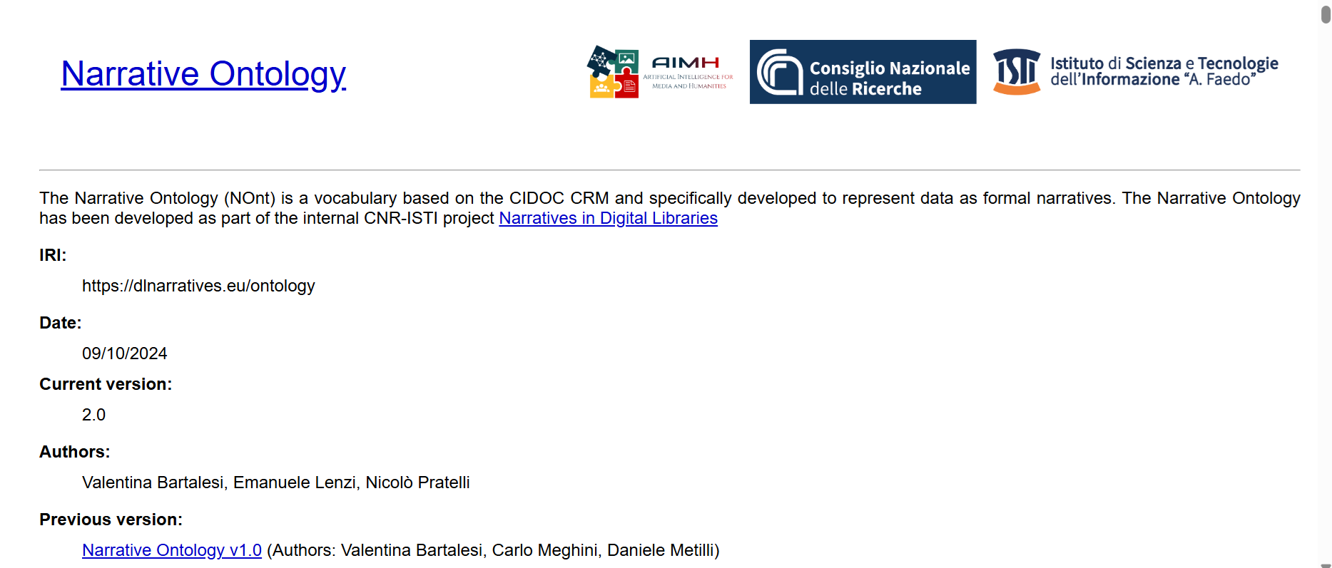 The Narrative Ontology (NOnt) is a vocabulary based on the CIDOC CRM and specifically developed to represent data as formal narratives. The conceptualisation of the Narrative Ontology was based on notions found in Narratology and in the Artificial Intelligence (AI) literature, in particular in the Event Calculus theory. The ontology was validated in several National and European projects such as the H2020 MOVING and Mingei projects, the Horizon Europe Craeft and PlaceMUS XR projects, the Italian National Research project IMAGO.